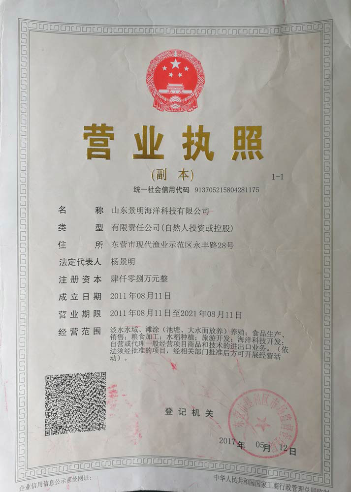 山東景明海洋科技股份有限公司成立于2011年8月,位于東營市現代漁業示范區,是一家集科研、水產品加工及銷售、休閑觀光、旅游開發于一體的一二三產業高度融合的省級農業產業化龍頭企業。公司下轄100畝水產品精深加工基地,公司可年加工黃河口名優水產品5000噸,產品通過景明水產專營店以及京東黃河口館、天貓、淘寶、建行善融商務、郵儲銀行郵樂網等線上銷售平臺銷往各大城市。